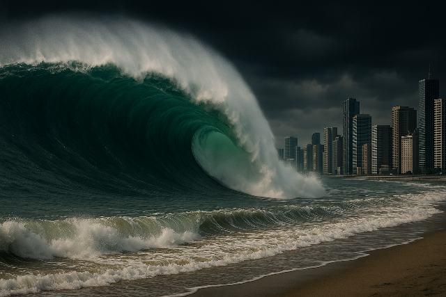 Ilustrasi gelombang tsunami, dentuman dan suara misterius sebelum gempa dan tsunami. (Foto: Created by ai.stmikkomputama.ac.id/Ridlo/Universitas Komputama (UNIKMA) Cilacap)