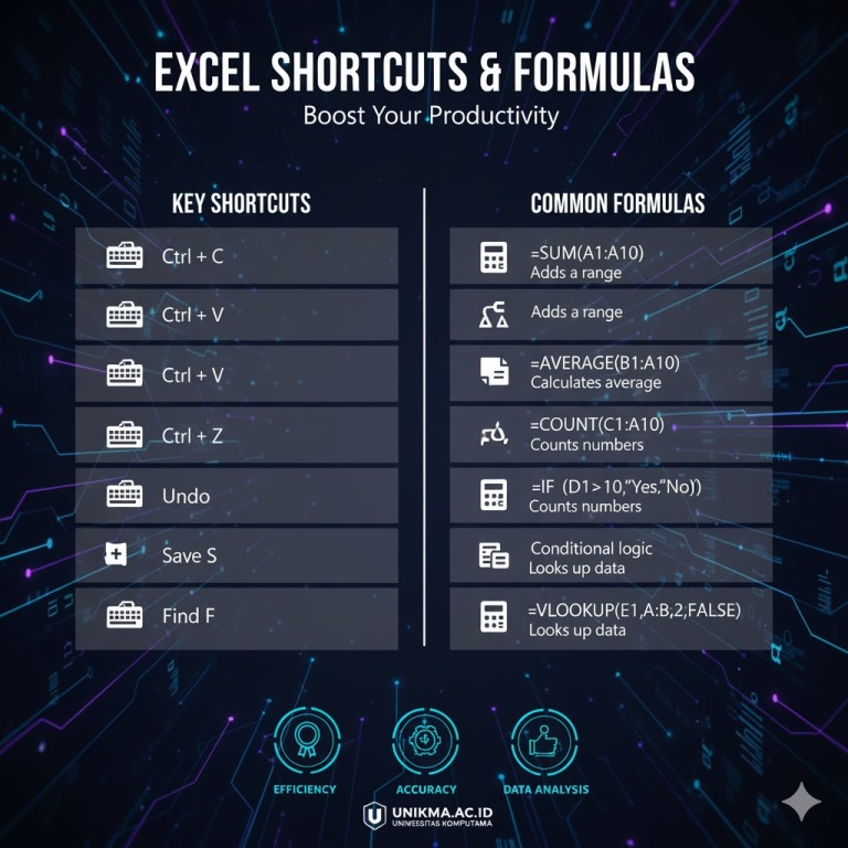 Universitas Komputama – Sebagai pengguna Excel, Anda pasti ingin meningkatkan produktivitas dan efisiensi kerja Anda. Salah satu cara untuk melakukannya adalah dengan menggunakan shortcut keyboard dan rumus-rumus yang tepat. Berikut adalah kumpulan shortcut keyboard Excel dan rumus yang perlu Anda ketahui: